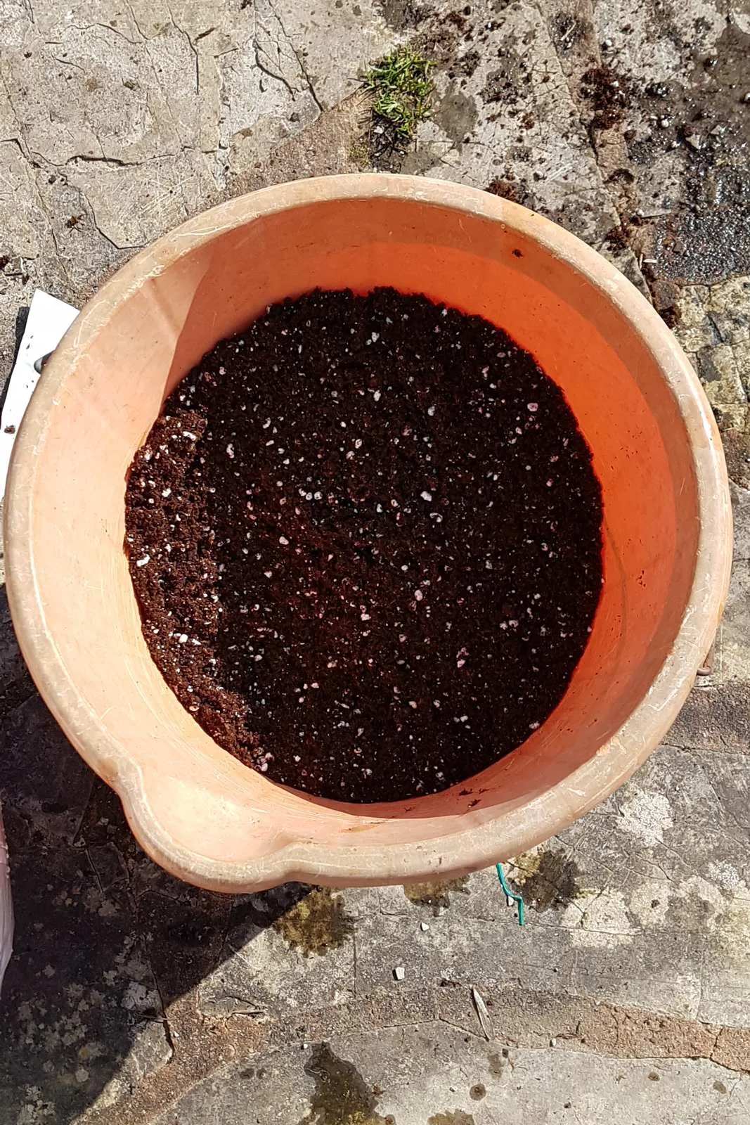 Fill the pot so the compost is slightly domed and press the surface down gentle so it’s flat. Don’t press too hard or you will compress the soil too much. Your plant won’t appreciate it!