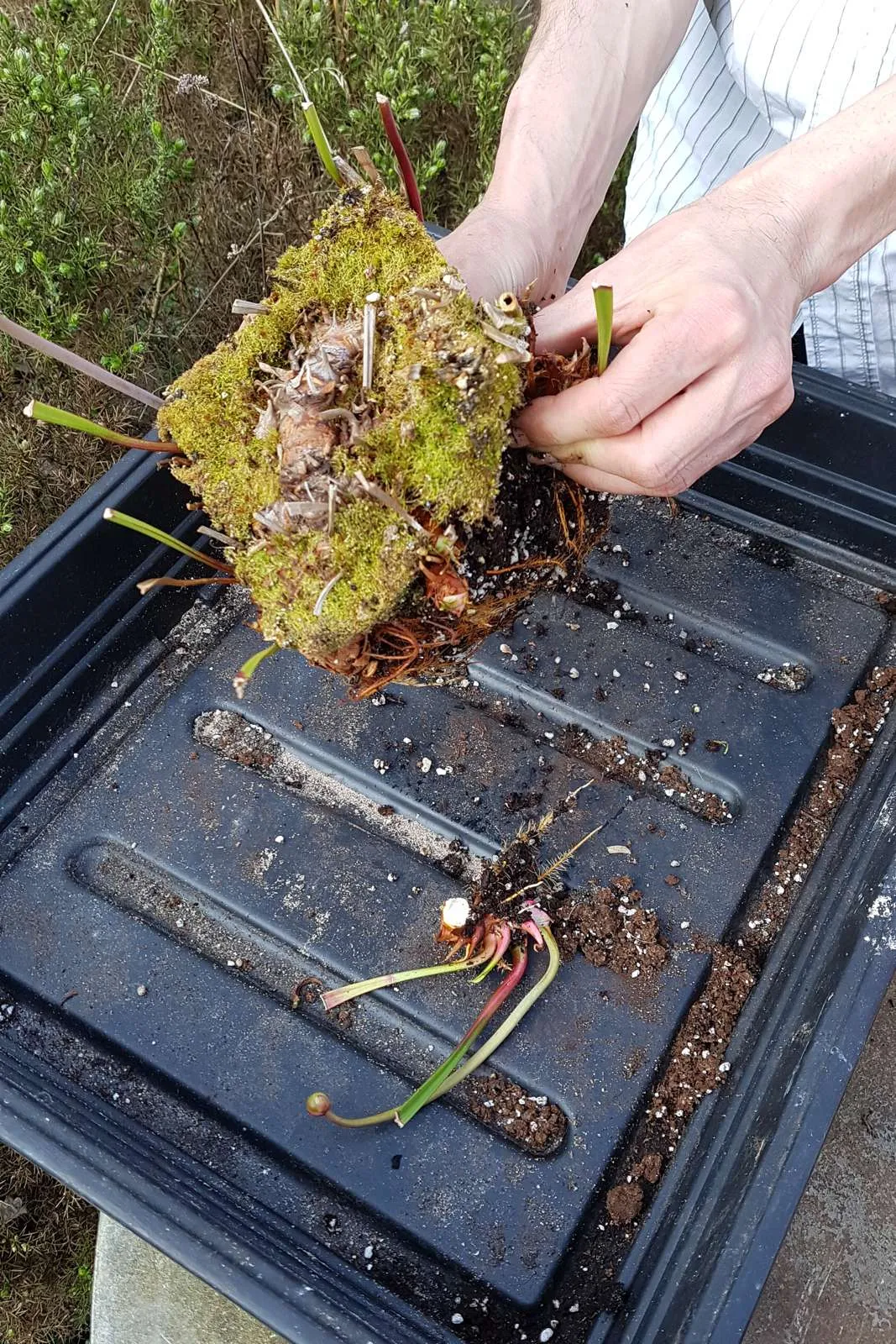 The plant to be repotted and divided Sarracenia won’t grow in normal garden compost. You need something that has no nutrients and has some drainage. Fortunately they aren’t that fussy!