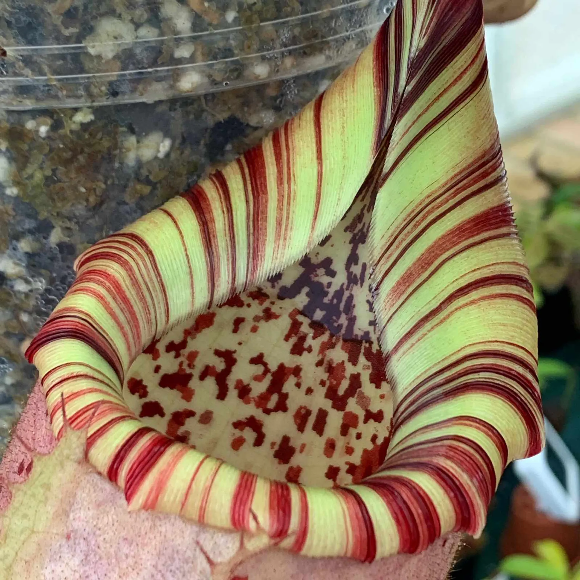 Nepenthes veitchii #5 x Pink Candy Cane: “A horticultural grex done in 2019. #5 is a striped (k) form that had the squattest shape and widest peristome from a large batch of individuals, and Pink Candy Cane is an outstanding breeder described above. The offspring from this cross are still young but so far we’ve noticed a lot of pinks and reds. I expect them to inherit the outstanding characteristics from both parents.”