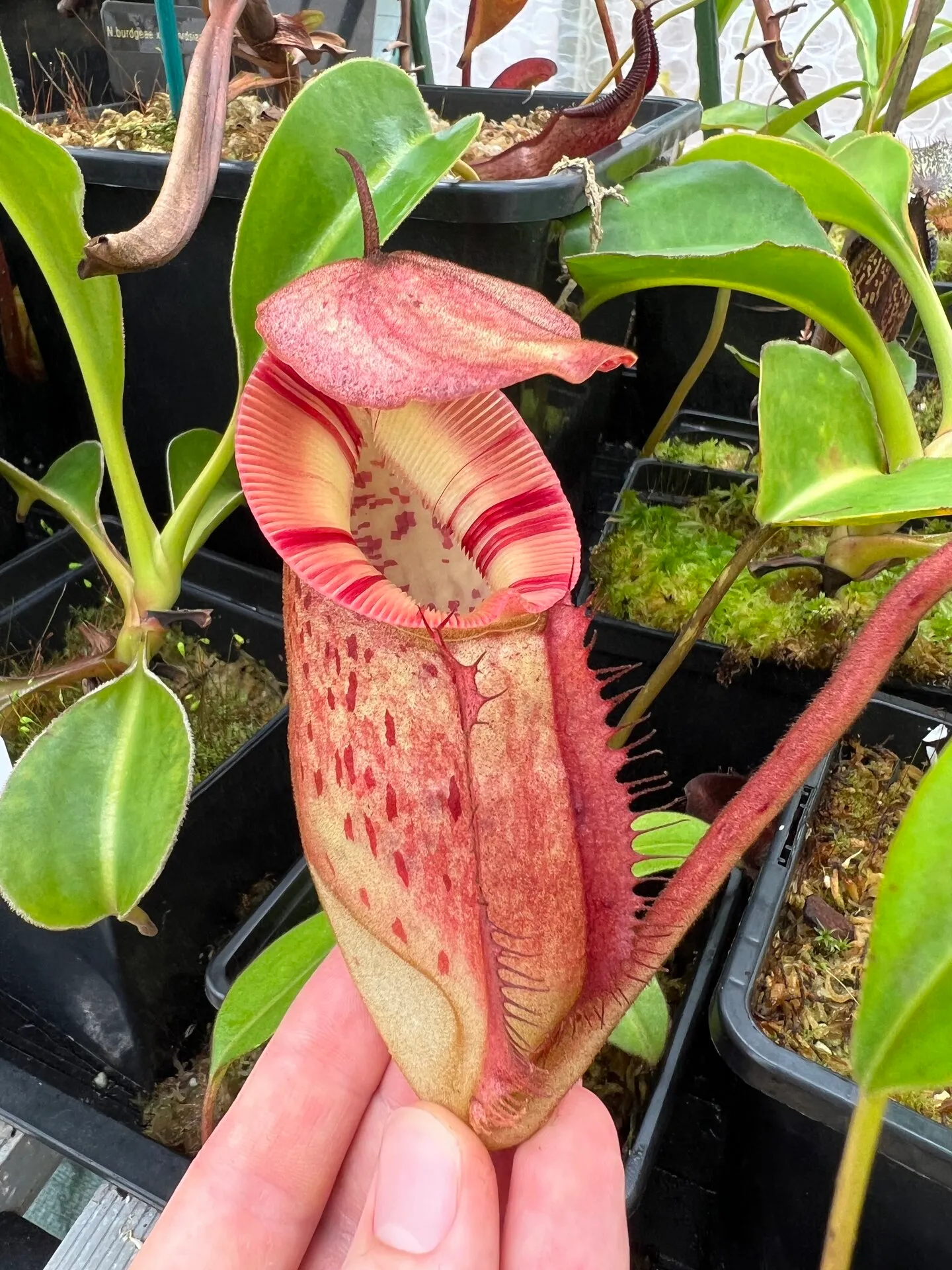 This is the famous single-clone release from Malesiana Tropicals (MT), popularly known as “burbeddy”. It’s important to note that this individual was germinated from wild N. burbidgeae seed, and so the male parent is actually unknown. The N. edwardsiana labelling is simply a guess.