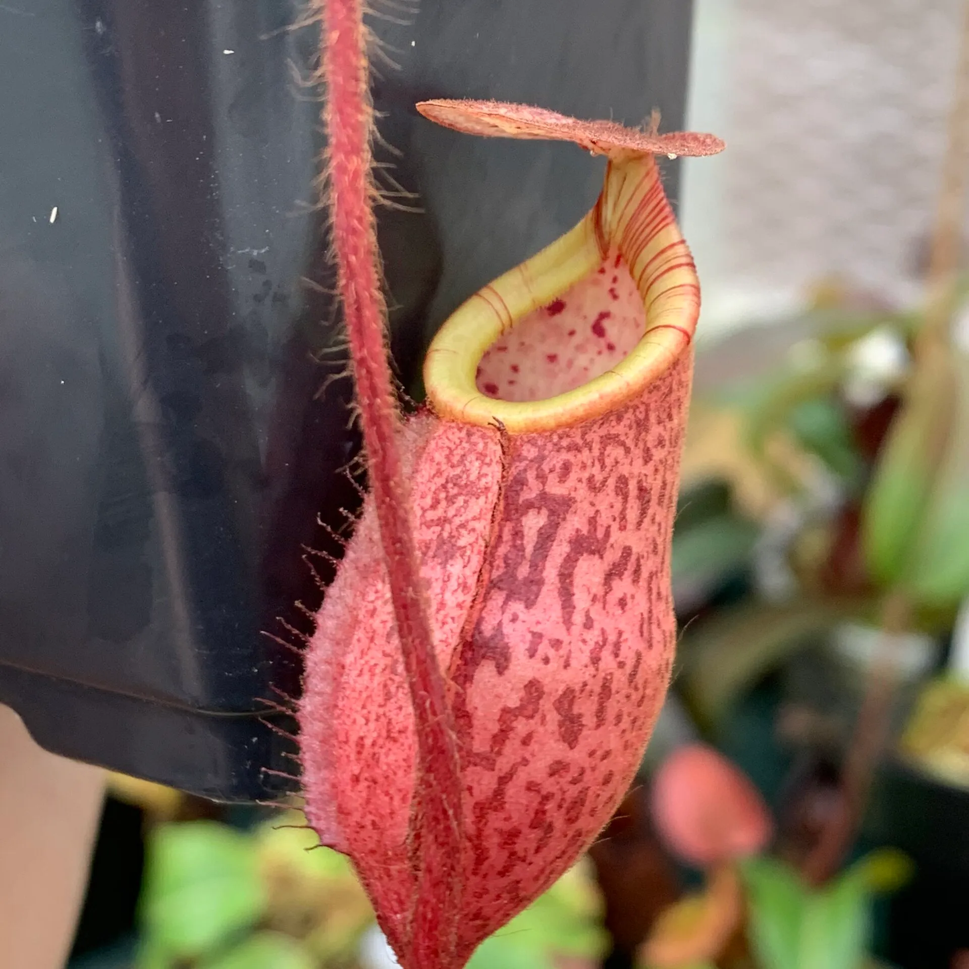 Other noteworthy characteristics include the thick indumentum of brown hairs which cover all parts of the plant, similar to N. mollis and N. veitchii. It’s a highly variable species, but many individuals exhibit highly squat pitchers with brightly striped peristomes. It’s also widely recognised among hobbyists for the bright red underside of its leaves, but this trait is not universal.