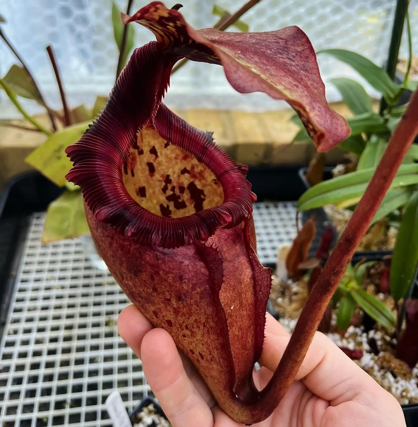 Anyway - this is a gorgeous plant that exhibits the best traits of its parent species. I’ve found it to be an extremely vigorous grower with huge leaves and pitchers. It tolerates my conditions year-round, from my intermediate summers to my highland conditions the rest of the year. It seems most hybrids with N. rajah as the mother inherit that species’ extensive root growth and benefit from a large pot. This plant is no exception - it’s in a 12 litre pot and already outgrowing it.