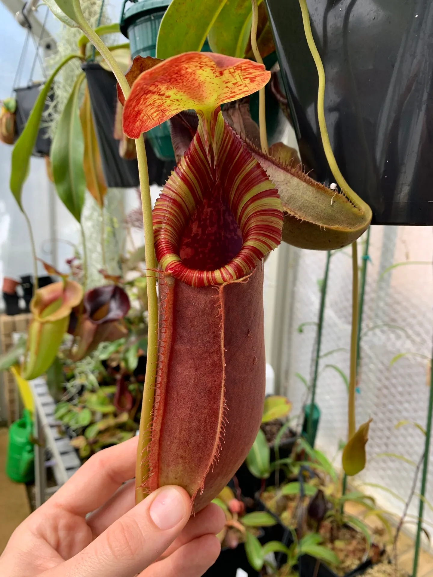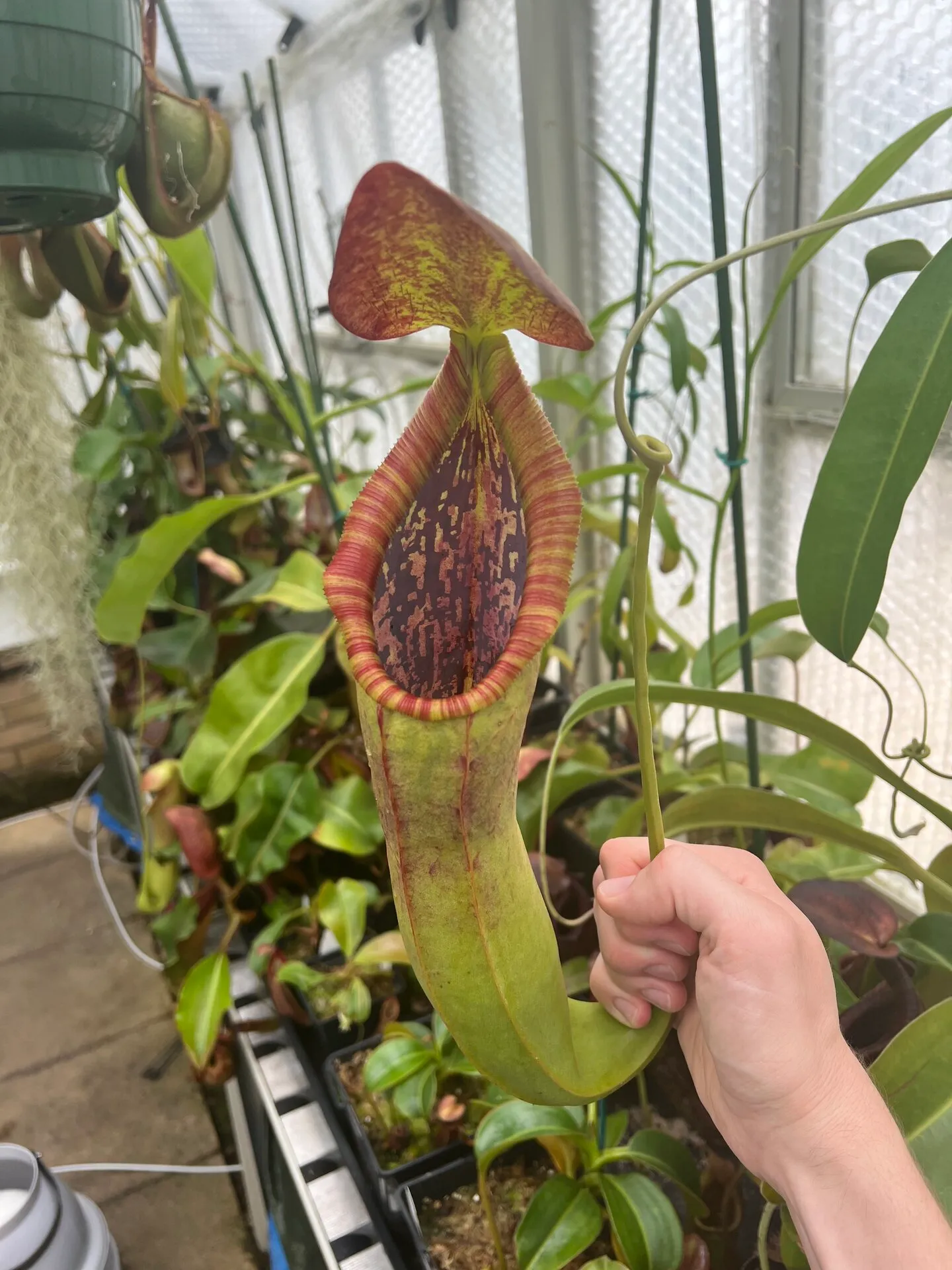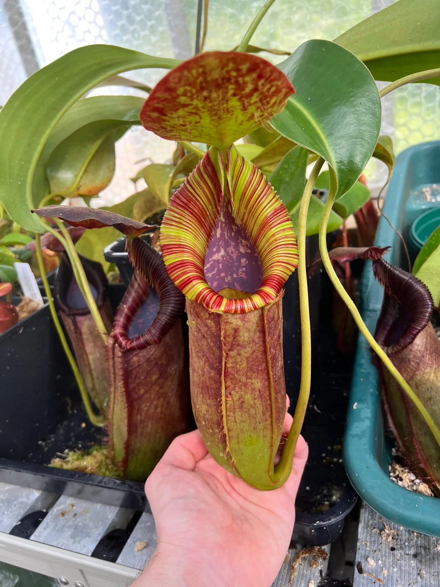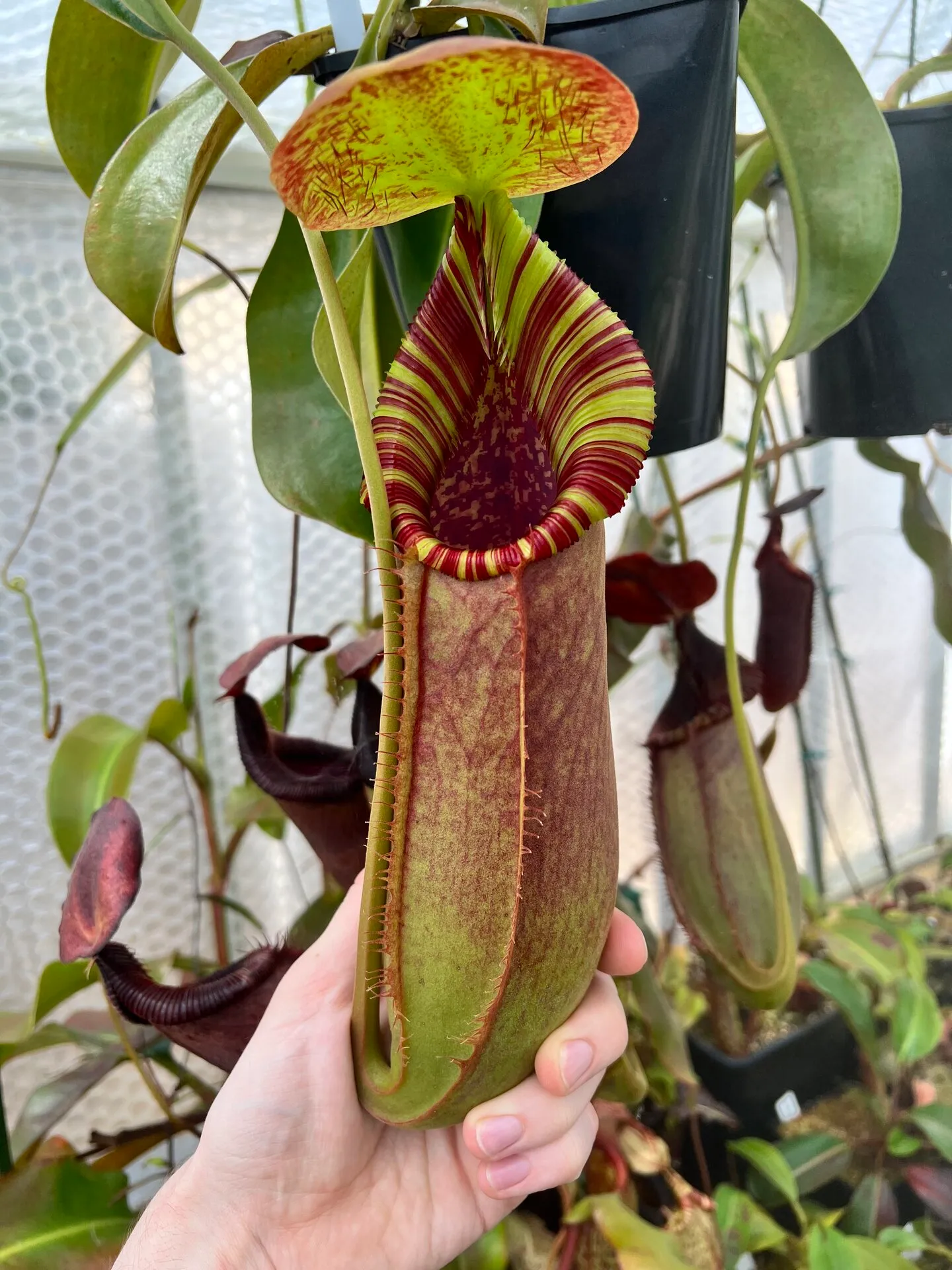 I bought this particular plant on a visit to Chris Klein’s nursery in Germany, in 2019. While the same cross has been produced by Borneo Exotics in the years since, I personally find these seed-grown plants from Chris to be more attractive. The lower pitchers are particularly stunning - while usually red with a beautifully striped peristome, they’re occasionally bright green depending on light and temperatures, making for a lovely contrast.