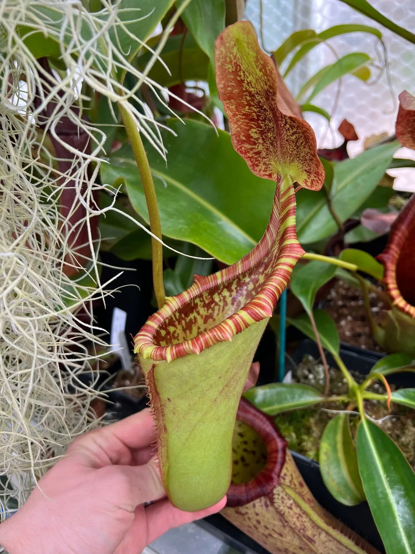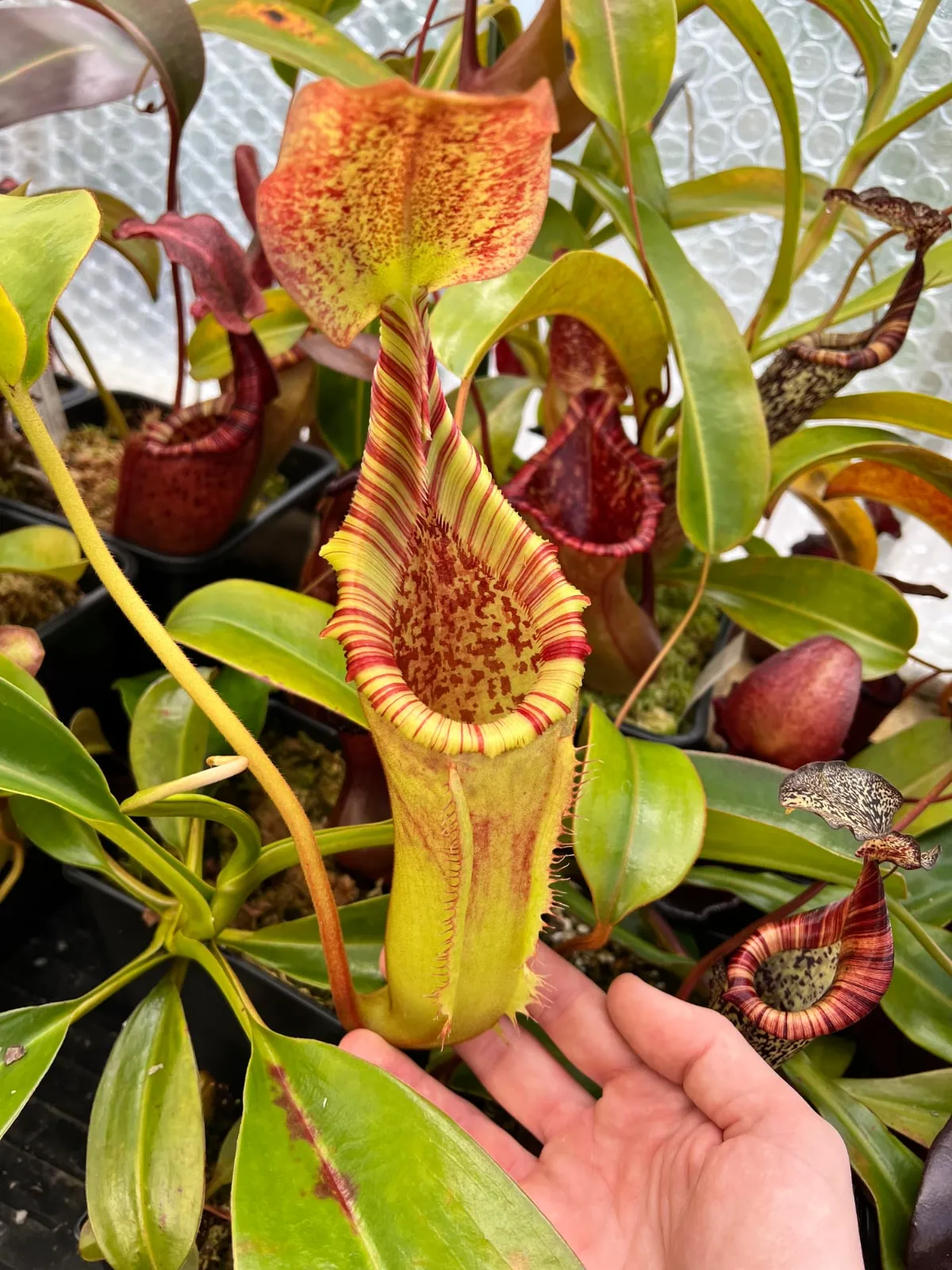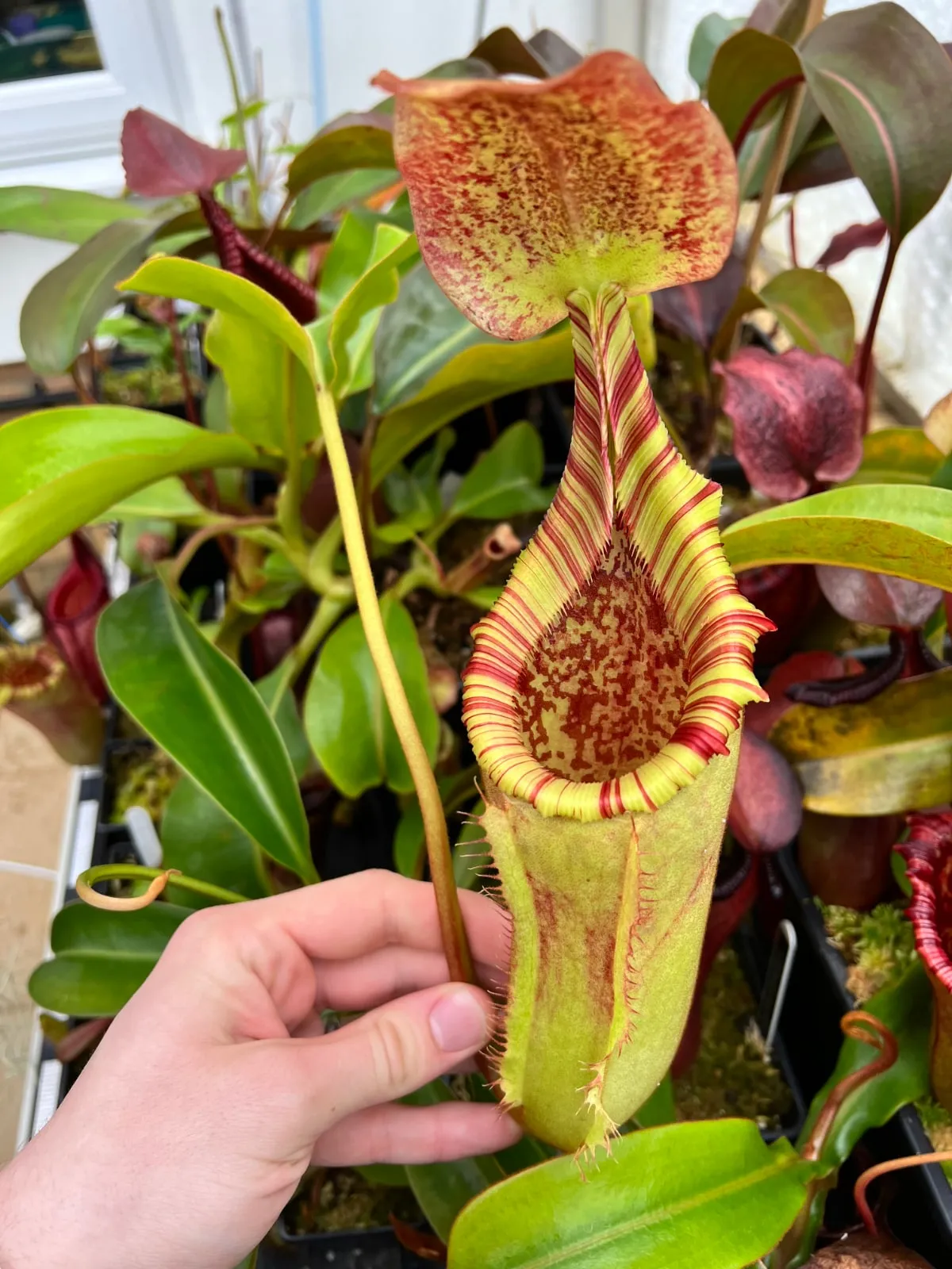 I grow two individuals of this cross, the largest of which is from Wistuba in Germany. As you can see from the photos, it has robust woody pitchers with ridged, candy-striped peristomes which retain their red and yellow colour as they age. Like both parent species, the pitchers last for a very long time - sometimes close to a year. My largest plant is yet to flower, so I don’t know if it’s male or female, but I look forward to making crosses with it when it does.